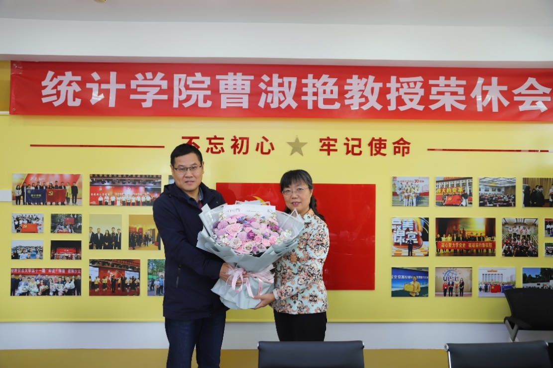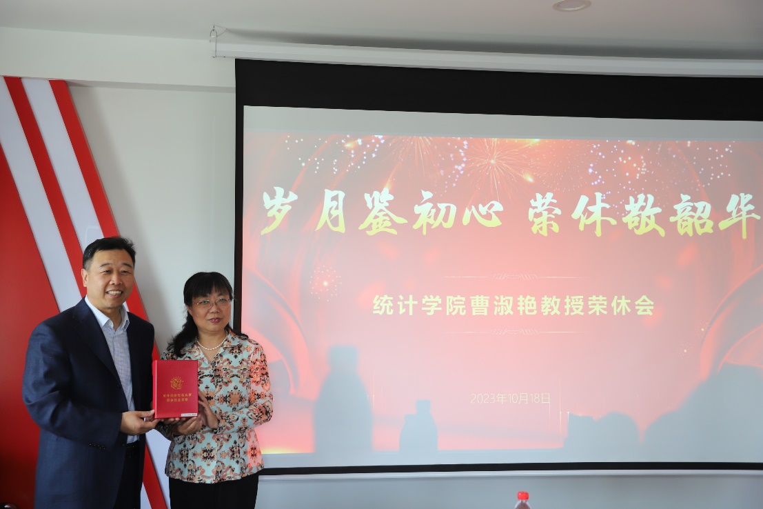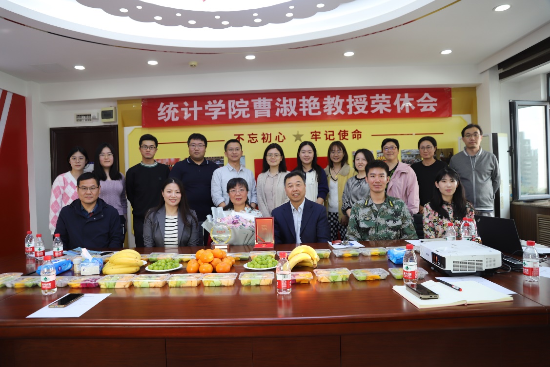 2023年10月18日下午,诚信楼727会议室温情满满,统计学院领导班子、工会主席、数据科学系教师们欢聚一堂,为曹淑艳教授举办温馨难忘的荣休会。