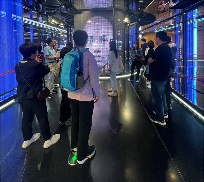 图书馆里宁静而庄严的氛围深深感染了学院教师,漫步在书架间,那些整齐排列的书籍仿佛在低语,诉说着智慧与历史的交融。参观元宇宙体验馆时,大家与虚拟形象对话“大学之道”,富含哲思的阐释震撼了每一个人。