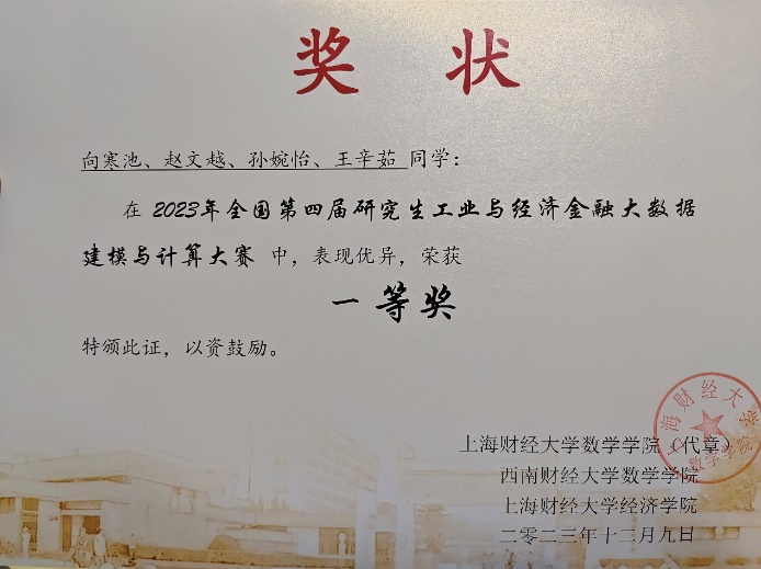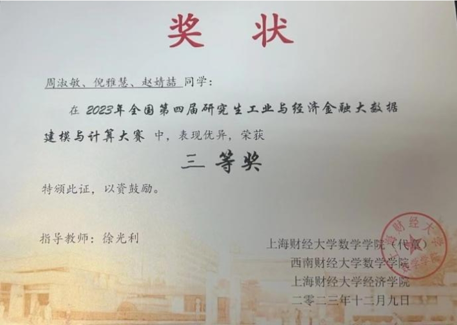 近日,全国第四届研究生工业与经济金融大数据建模与计算大赛决赛在西南财经大学举行。金沙8888js官方7名学生现场参赛:2023级研究生向寒池、赵文越、孙婉怡、王辛茹获全国一等奖,周淑敏、倪雅慧、赵婧喆获全国三等奖。金沙8888js官方青年教师徐光利组织学生参赛并担任其中一队的指导教师。