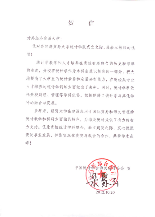 中国统计学会海关统计委员会贺信
