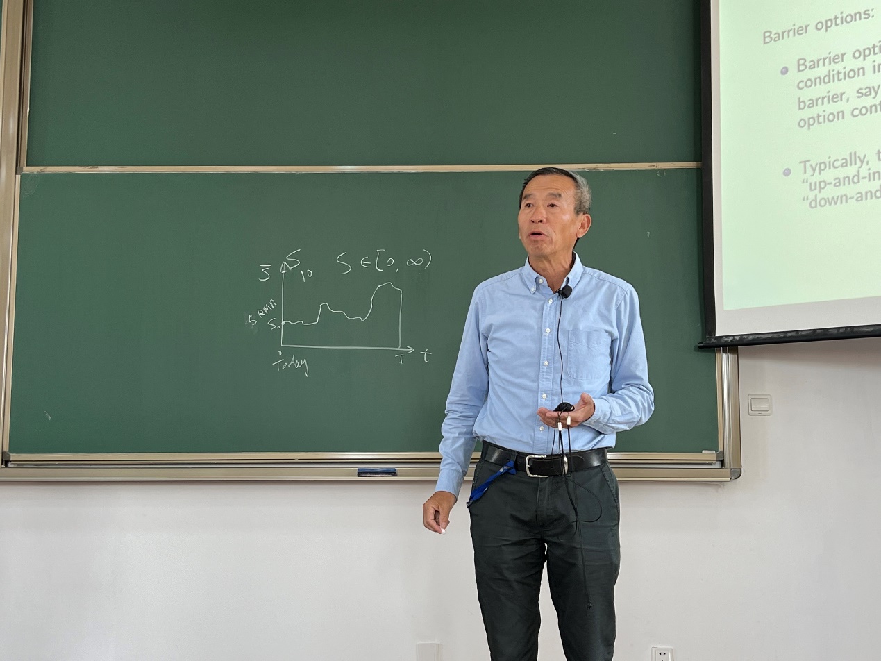 诸教授结合过去十年在奇异期权定价领域的研究经验,说明企业应该如何借助down-and-out Parasian期权来定量评估破产保护申请。首先,诸教授深入浅出地阐释了期权的概念、种类及其定价问题的核心思想,通过生动的实例,使学生们对期权等金融衍生产品及其背景知识在实际应用中有了更为清晰的认识。其次,诸教授详细介绍了科研团队在Parisian和Parasian期权定价方面的最新研究成果,拓宽了学生们在金融数学领域的研究视野。然后分享了如何通过积分方程克服在数值方法求解复杂偏微分方程系统过程中的主要困难。最后,诸教授结合恒大申请破产保护的最新案例,详细讲解了如何利用定量求解得到的最优执行价格进行决策分析,为业界有效管理破产保护申请提供了创新性的技术支持。