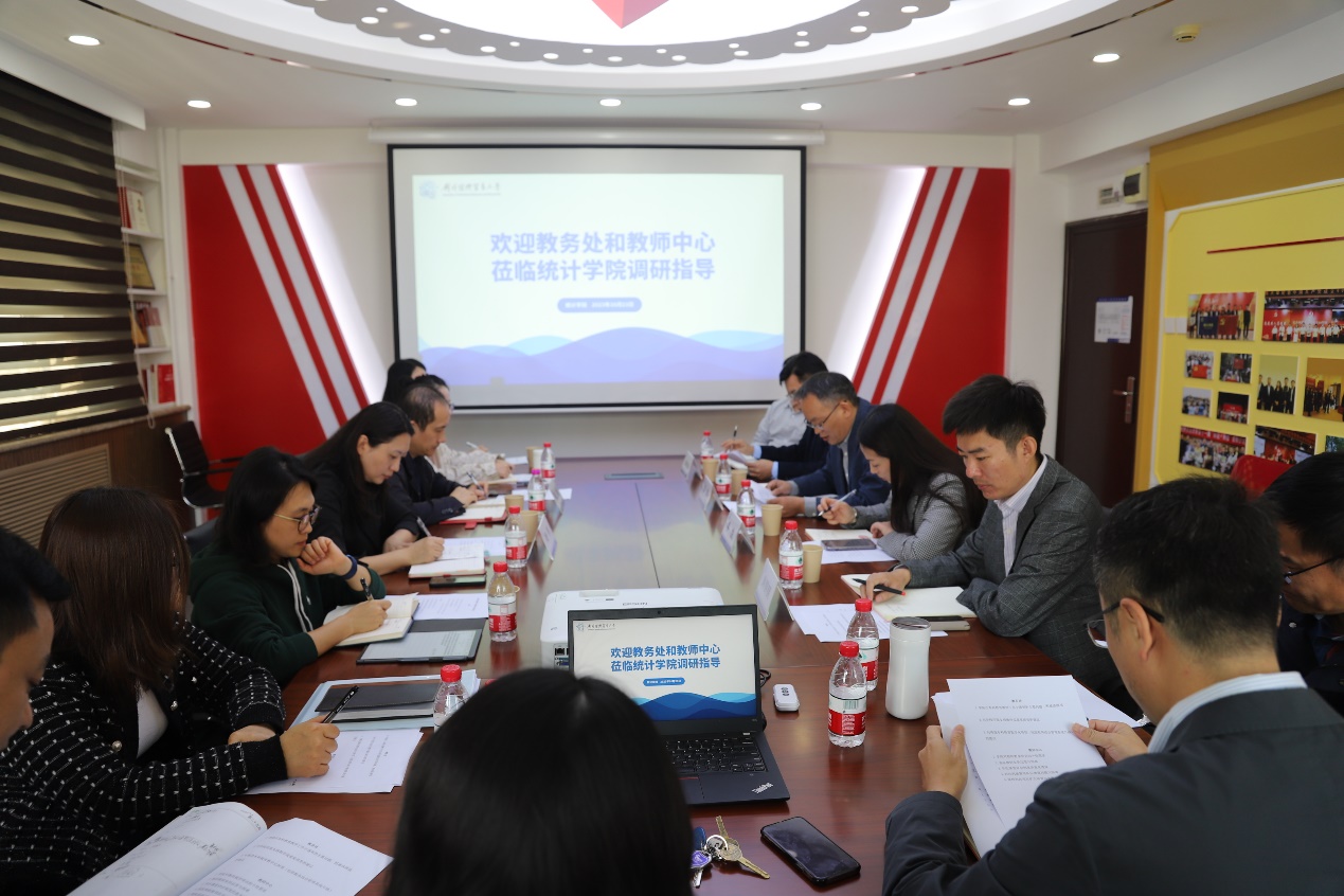 2023年10月23日中午,教务处处长毛捷、教师中心主任杨熙、教务处贾萧竹老师、教师中心刘美婷老师一行来统计学院调研。金沙8888js官方党委书记李悦、副院长郭伟、副书记肖明明、副院长唐晓彬、各学系主任与副主任,本科教务员参与调研座谈。会议由郭伟副院长主持。