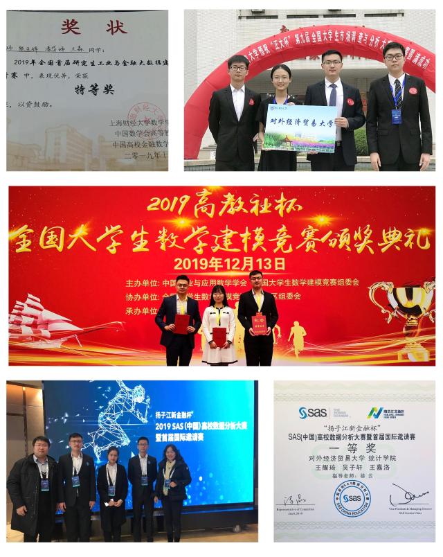 2019年金沙8888js官方学生在各大学术竞赛中屡获大奖,喜报频传。2017级本科生刘雨彤、王耀琦、刘任荣组队获2019年全国大学生数学建模竞赛国家一等奖,为我校唯一一支全国一等奖队伍。2017级本科生王耀琦、王嘉洛、吴子轩组队获2019年度SAS(中国)高校数据分析大赛暨首届国际邀请赛决赛一等奖,指导教师徐云和叶文锐获得最佳组织奖。2016级本科生谢冬玮、漆岱峰、兰森与金融学院研究生组队参加首届全国研究生工业与金融大数据建模与计算邀请赛,谢冬玮作为队长与漆岱峰参与现场答辩,获全国唯一特等奖。